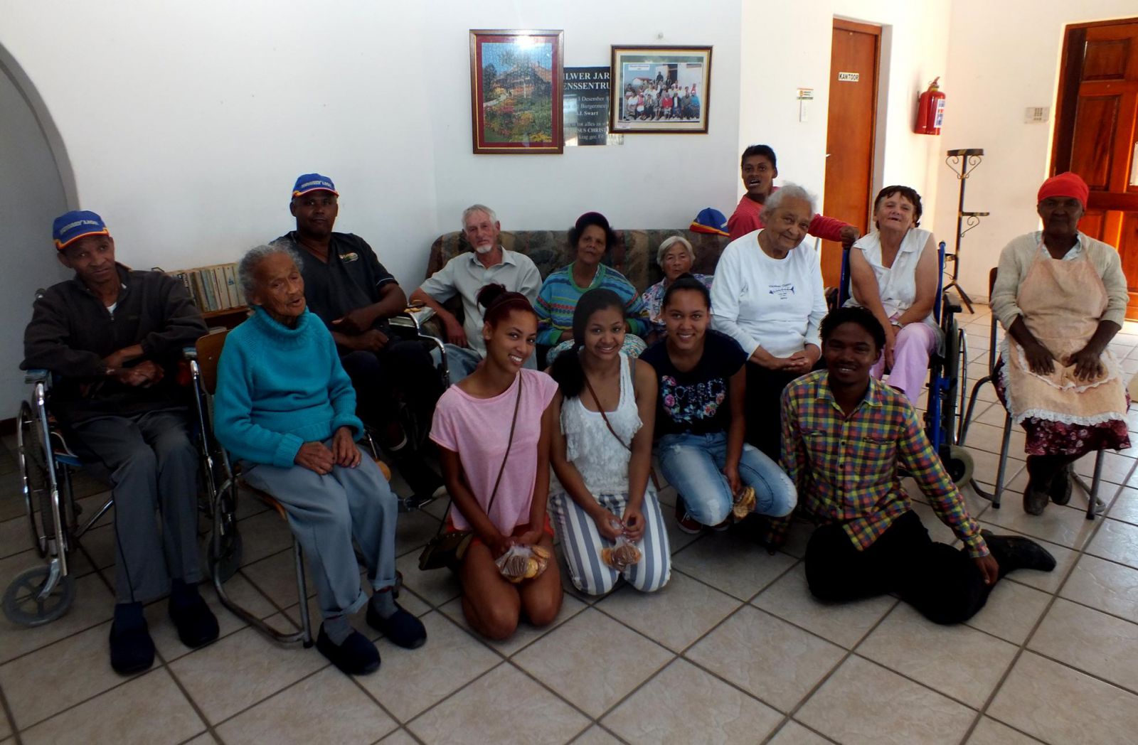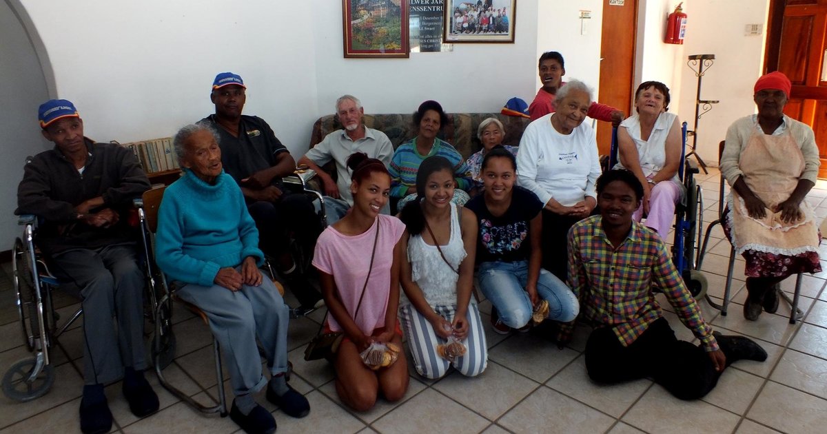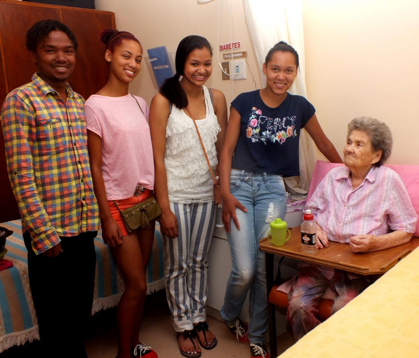 Vlnr is Rigardo Plaatjies, Tertia Pietersen, Mariska Mouers en Renaycia Pietersen in Sophie Lourens se kamer tydens die groep se besoek aan Herberg-aan-See Tehuis vir Bejaardes