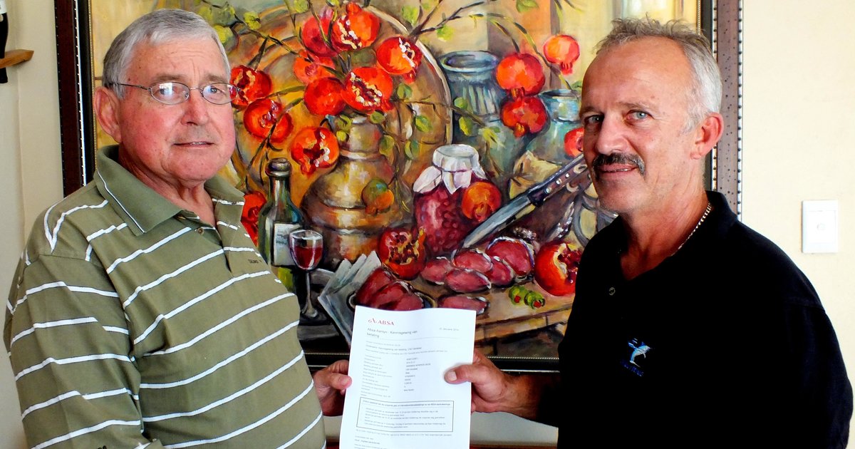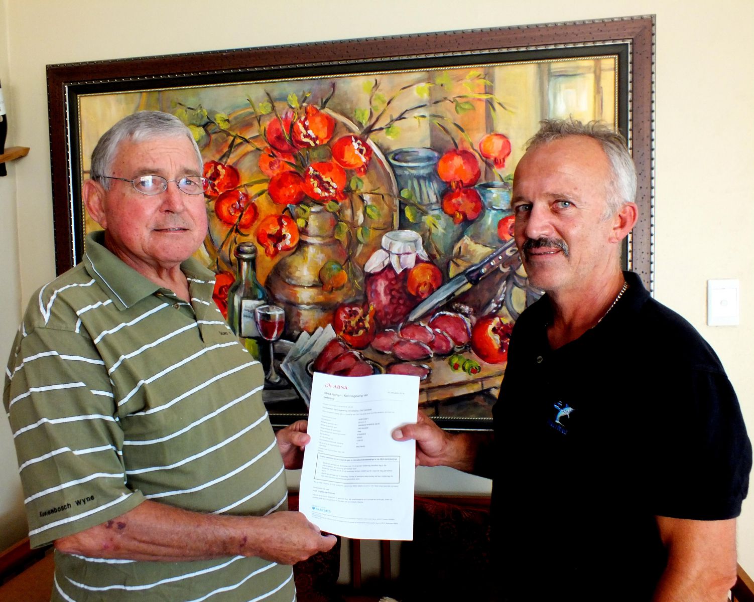 Helmie de Vries van Gansbaai Wynproegilde oorhandig die elektroniese oorbetalingsbewys ten bedrae van R5,000 aan Mike Kemp, voorsitter van Gansbaai CAD