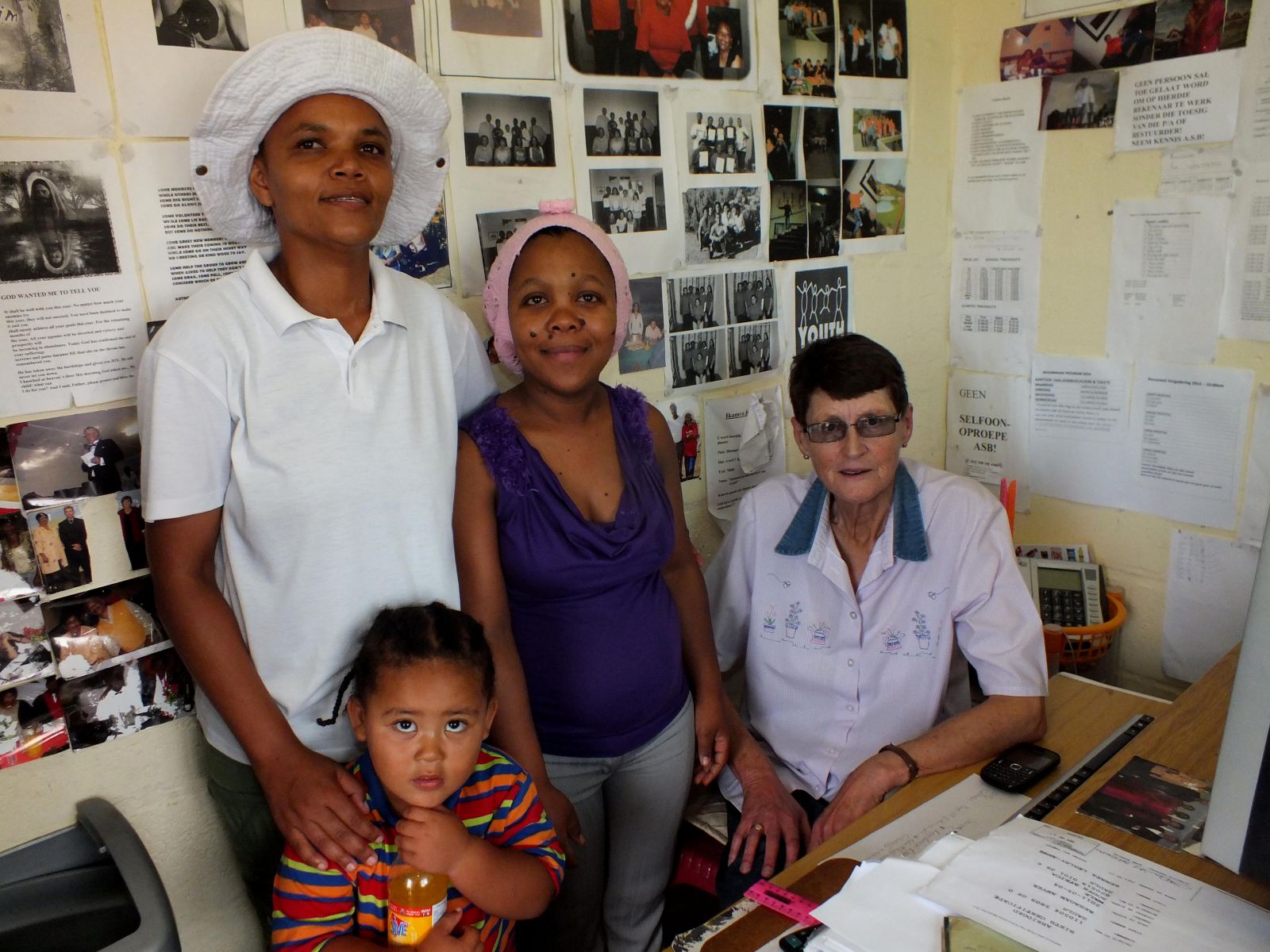 Vlnr is Jolande Sauls saam met Ikamva se maatskaplike werkers, Lizel Murtz en Hester du Preez, met een van die créche se kleuters wat besluit het sy wìl afgeneem word
