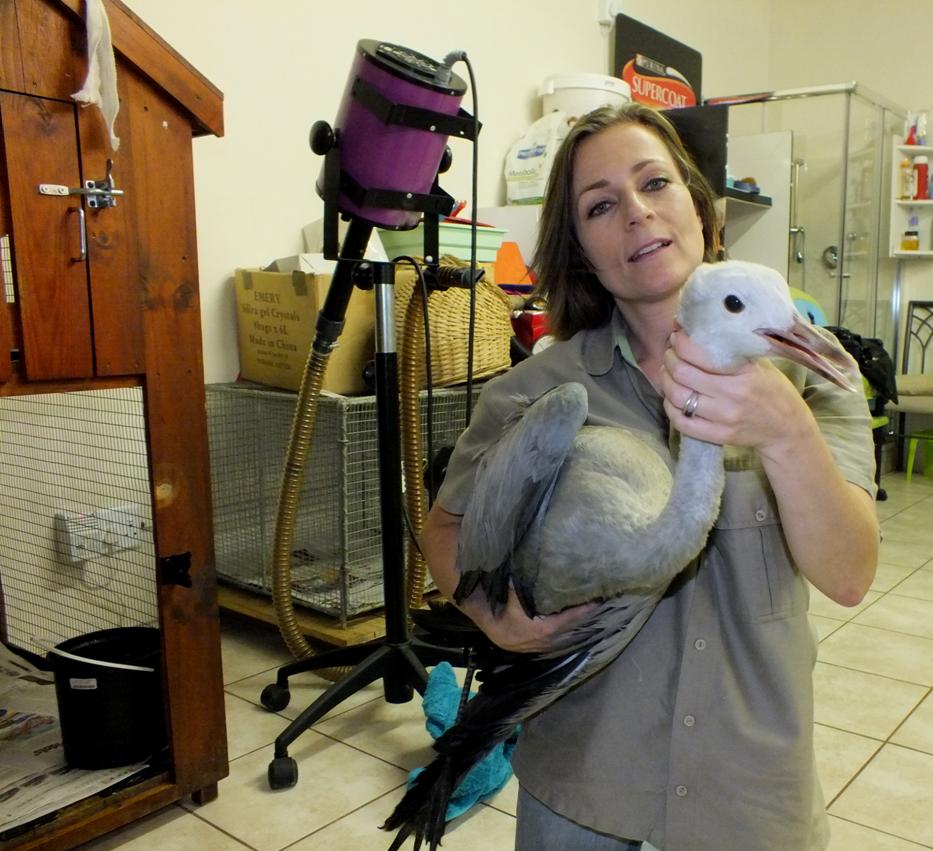 Dr Liesel Trollope met die Blou Kraanvoël in haar spreek-kamers nadat sy reeds die nodige gedoen het om hom te help