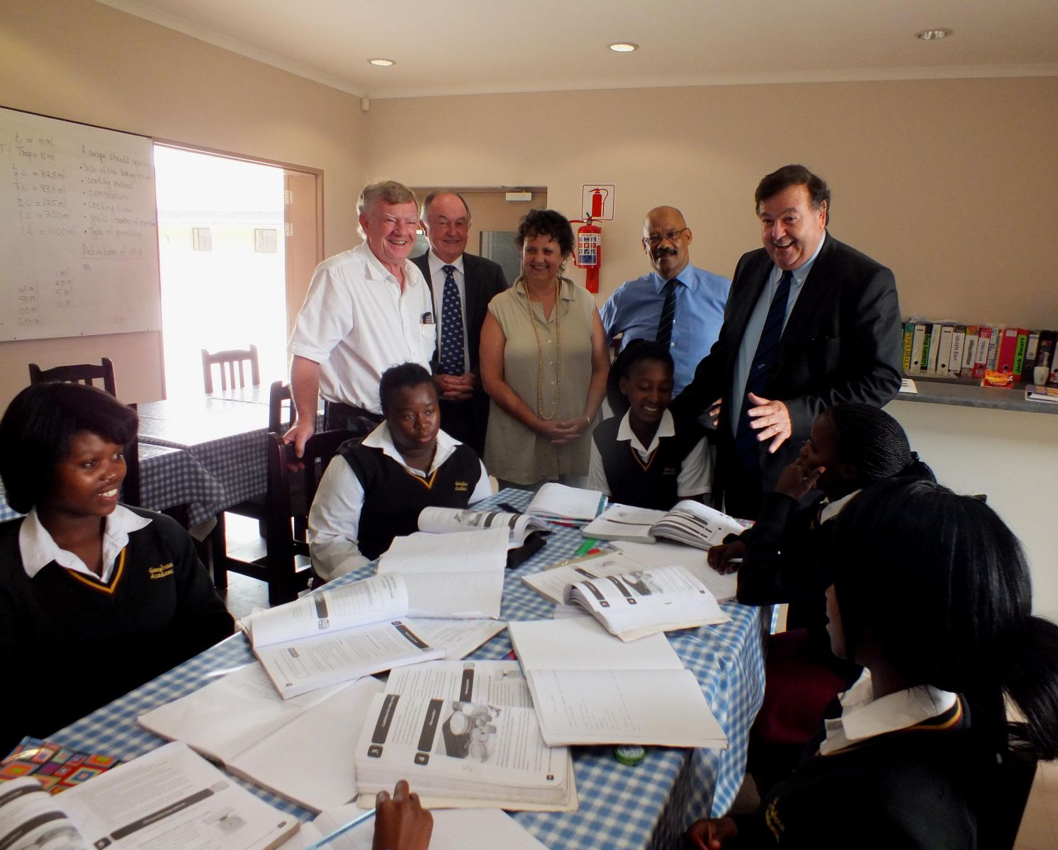 Gansbaai Academia is eerste besoek, waar hy die skoolhoof, mnr Tommy Wilson, ontmoet het. Hy het die skool eerstens gelukgewens met hul verbeterde matriekuitslae die afgelope jaar. “Ek het die skool se uitslae met die minister bespreek en hy was duidelik beïndruk daarmee,” het mnr Wilson gesê. “Hy was ook beïndruk met die feit dat dit ons tweede matriekjaar was en het die vermeerdering in universiteits-toelatings as skitterend beskou.” Die minister het mnr Wilson gevra om die getalle in Wiskunde en Fisiese Wetenskap verder te verhoog. “Hy het ook sy trots uitgespreek met Bianca se prestasies en haar toelating tot KOVSIES, asook Michelle le Roux wat tans op ‘n uitruilprogram in Frankryk is,” het mnr Wilson voorts gesê. “Ek het hom verder verseker dat ons na ‘n 100% slaagsyfer in 2014 strewe, asook ‘n verdere styging in universiteits-toelating.”