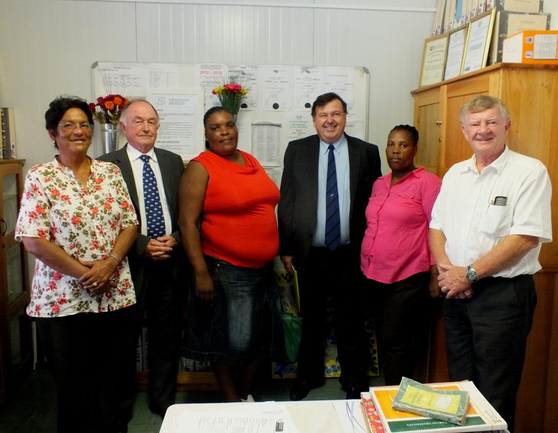 Vlnr is rdl Moira Opperman, mnr Mike Walters, me Mali (skoolhoof), minister Donald Grant, rdl Ndevu en rdh Pieter Scholtz tydens die minister se besoek aan Masakhane Primary School