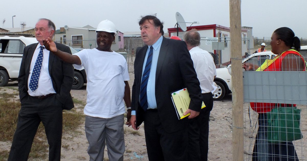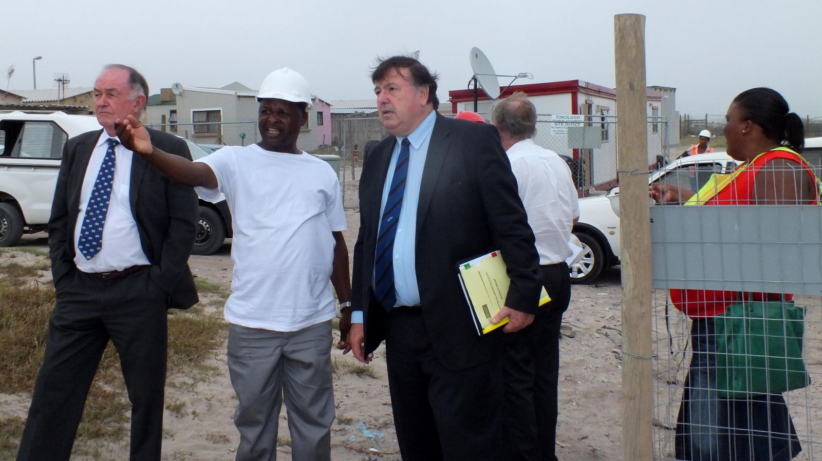 Good Friday (2de van links) verduidelik die bouproses van Masakhane se nuwe laerskool aan minister Donald Grant (regs)
