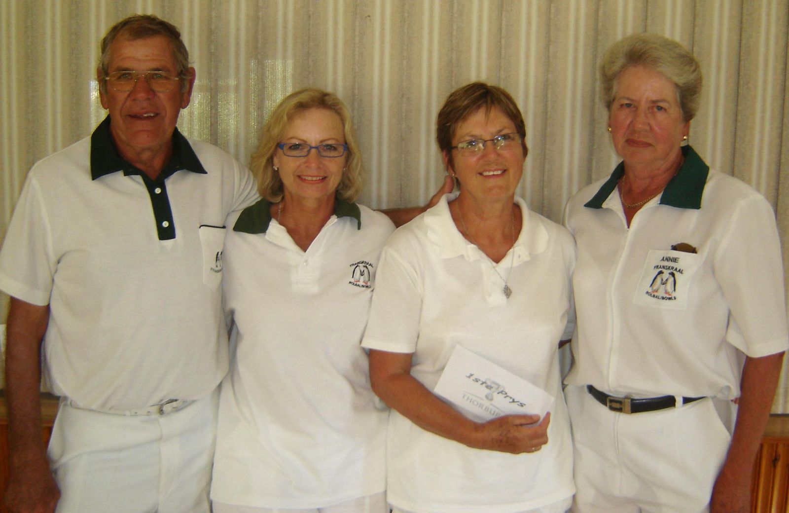 Vlnr Tommie van Niekerk, Jane de Villiers, Adri Bester en Annie Smit verteenwoordiger van Thornburn (borg van die dag)