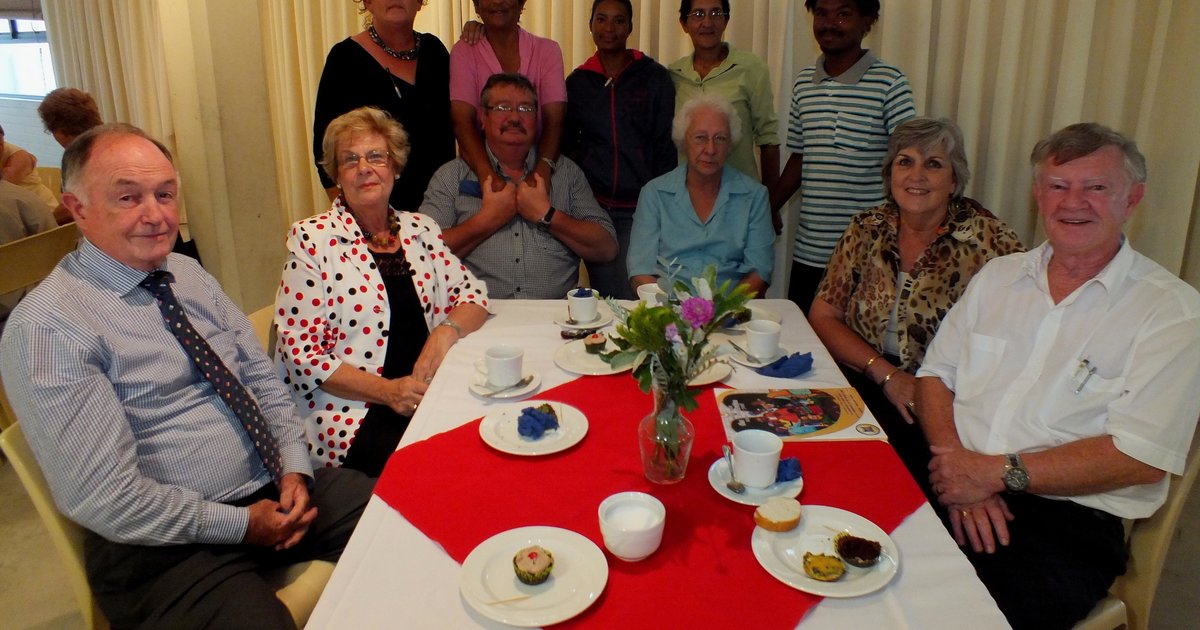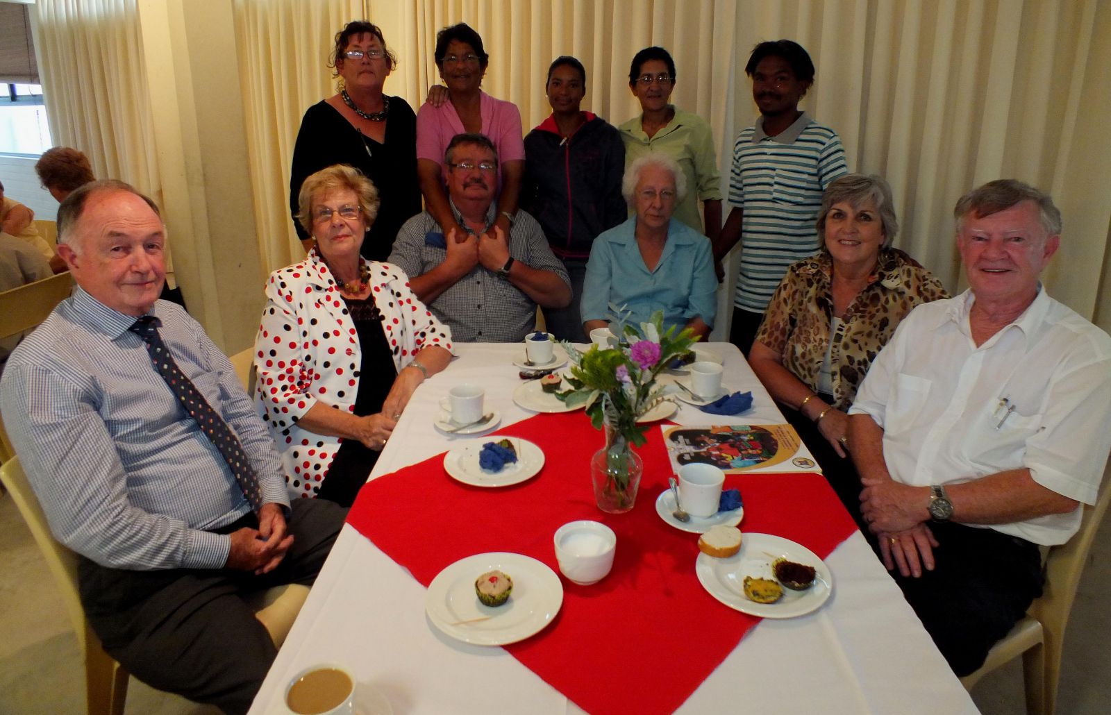 Vlnr regs om die tafel is mnr Mike Walters (LPP), rdl Nicolette Botha-Guthrie, John van Rooyen, Suster Linda Meyer en Ans en rdh Pieter Scholtz. Agter vlnr is Angela Caie, rdl Moira Opperman, Sherie Jansen, Jacoba Europa en Rigardo Plaatjies