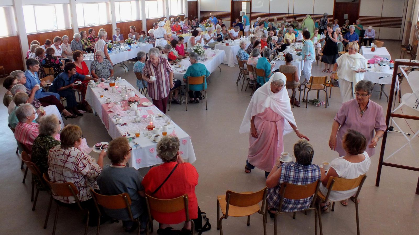 “Lorraine het pragtige kennisgewingskaartjies ontwerp, met Linda wat vir agtergrondmusiek gesorg het,” sê Dalena. Hettie Oosthuizen het die verwelkoming en opening waargeneem. “Die sowat 110 dames het elk ‘n bossie laventel met ‘n kaartjie met die tema daarop ontvang.” Twee gasvrouens aan elke tafel het onderskeidelik soos ‘n Bybelse- en ‘n Moderne vrou aangetrek. Elma het tydens haar aanbieding op 5 eienskappe van die vrou gefokus, met 5 van die tafels wat daarvolgens versier is: Vreugde is blydskap - groen (Johanna en Agnes); Vrolikheid is gelukkig wees - geel (Vea en Ansie); Vrede is gemoedsrus - wit (Ronel en Lorraine); Vriendelikheid is ook die taal wat dowes kan hoor en blindes kan aanvoel - blou (Sylvia en Marianna); Vrygewigheid is barmhartigheid en mededeelsaamheid - pienk (Charlene en Miempie).