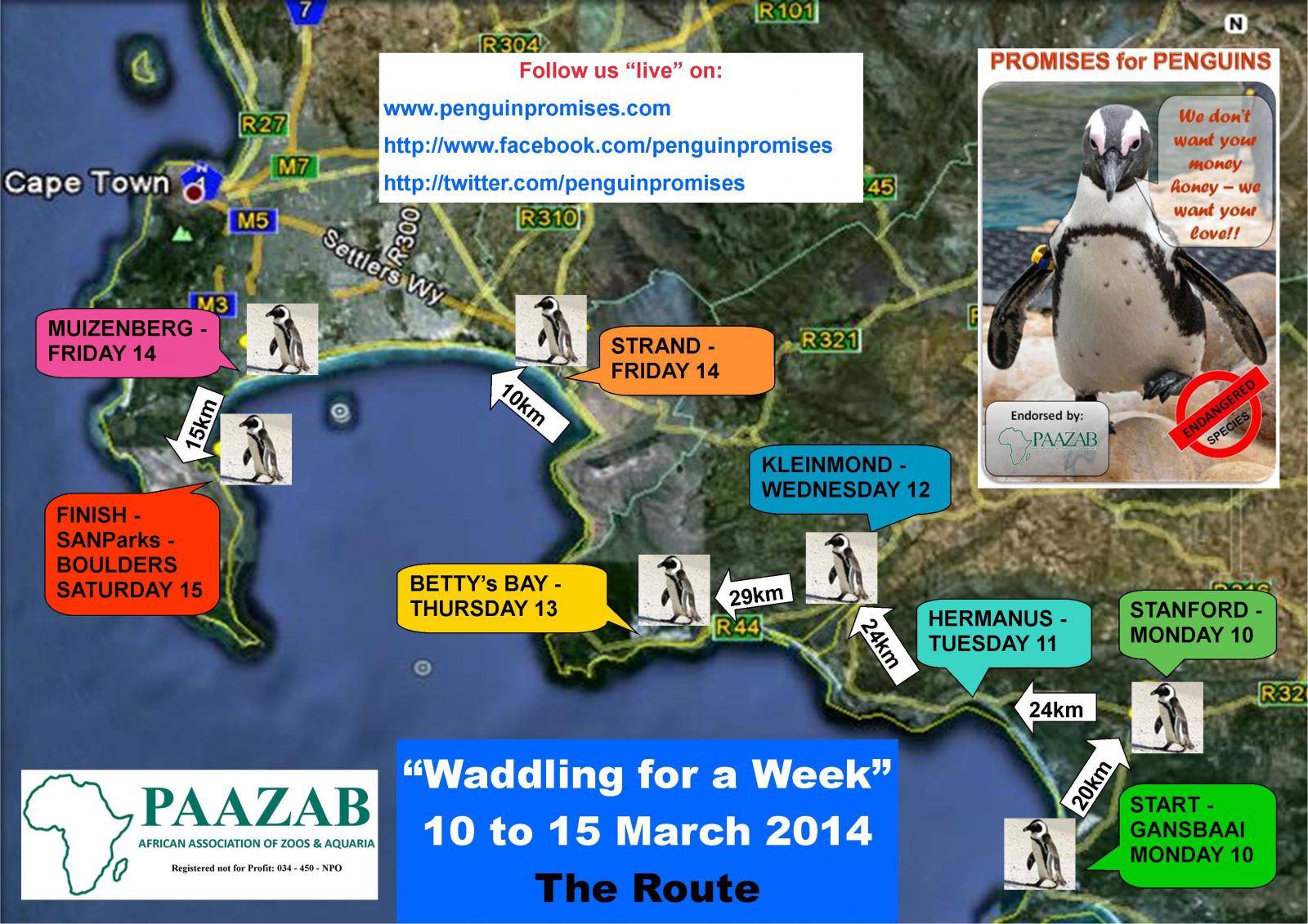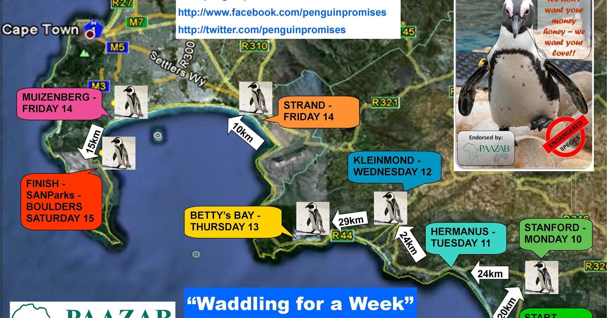 The 4th annual Penguin Promises Waddle for a Week will be taking place from 10 to 15 March 2014. An intrepid group of Waddlers will be setting off from Gansbaai, walking their way to Simon’s Town, while raising much needed awareness about the plight of the endangered African penguin. The Penguin Promises Waddle for a Week is an AKAA (Animal Keepers Association of Africa) initiative. The group of 16, tackling the 120km walk, consists of animal keepers from around the country as well as other animal enthusiasts and penguin supporters.
