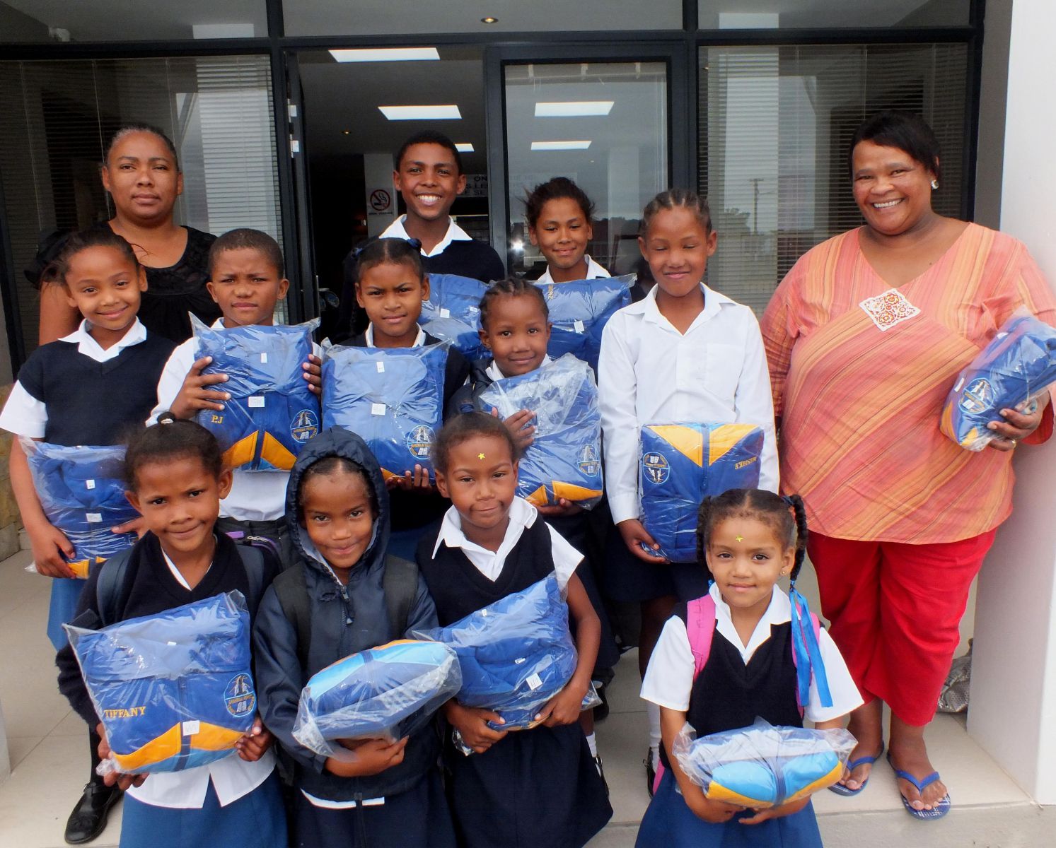 Die opgewonde leerders van Gansbaai Primêr nadat hulle hul sweetpakke ontvang het, met Sara Niemand regs en Carmen Hans links