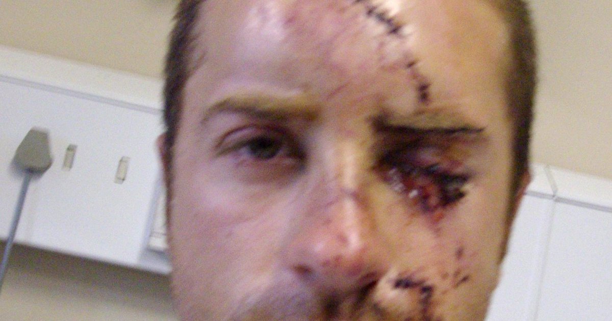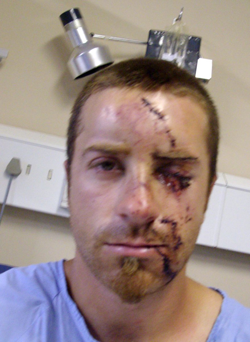 Riaan Burger, wat 4 jaar gelede ernstig by Montego’s aangerand is, se snymerke kan hier gesien word terwyl hy in die hospitaal behandel is.