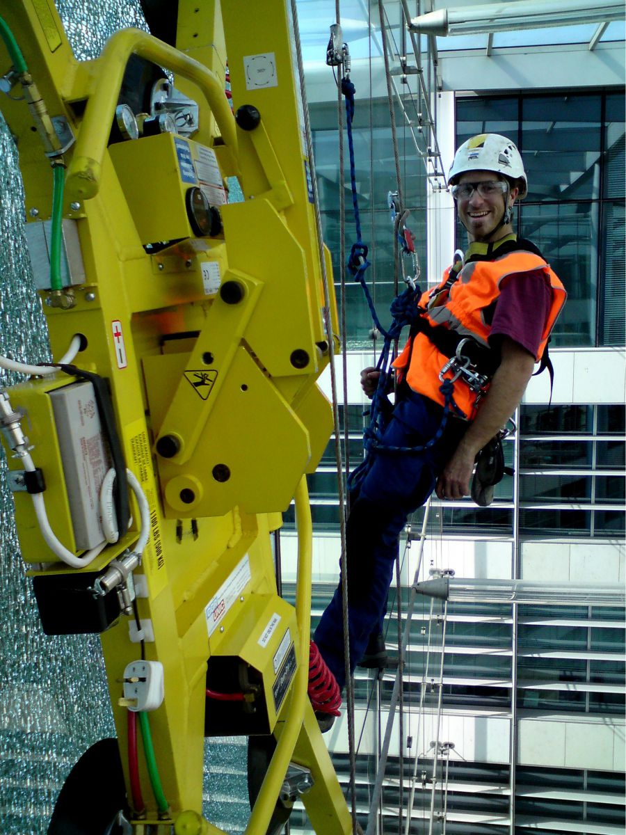 Riaan tydens 'n werkkontrak besig met herstelwerk aan die buitekant van 'n hoë gebou