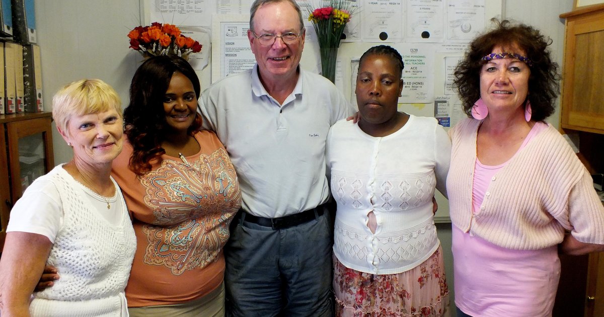 Vlnr is Anita Botha, Eveleyn Ndlebe, Jack Doyle, Nontsokolo Mani (skoolhoof) en Margi Muller by Masakhane Primary School, tydens Jack se besoek aan die skool