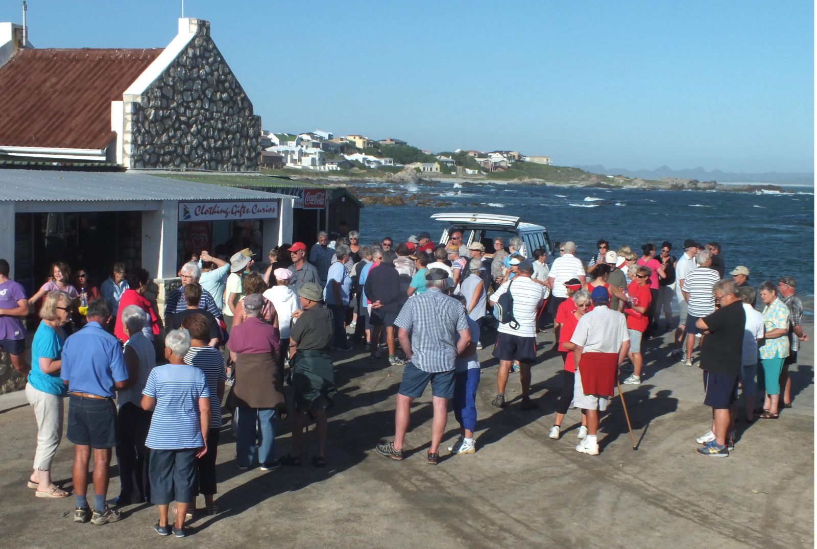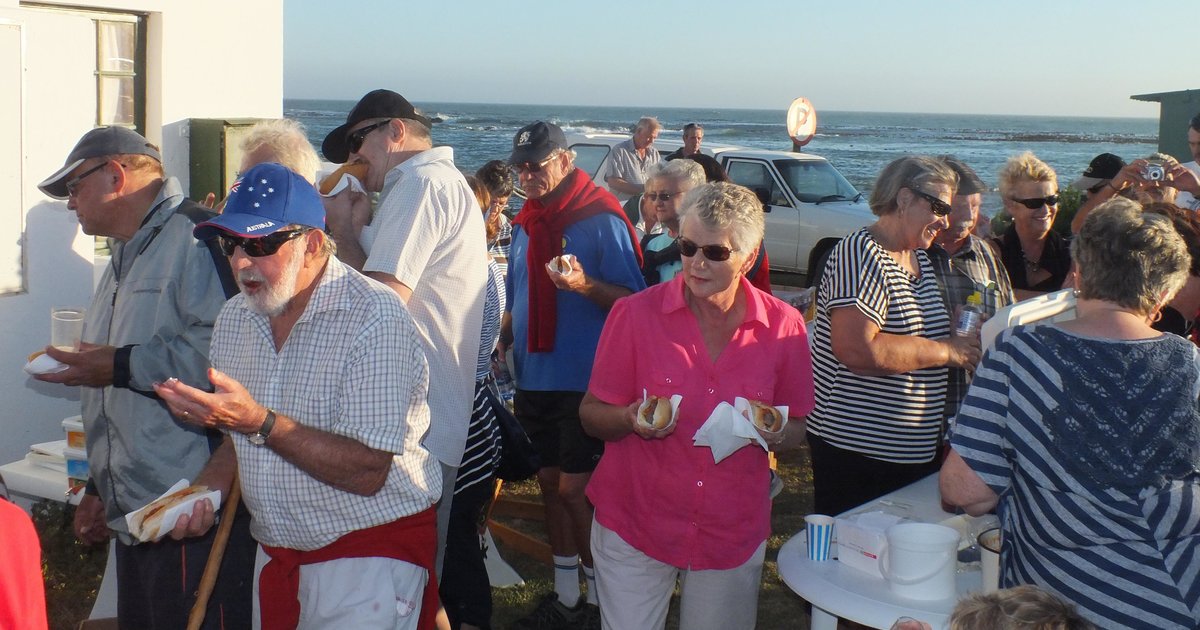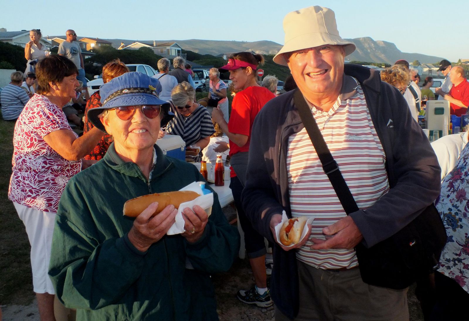 Soos gebruiklik is ‘n glasie sjampanje kort voor die wegspring by Kleinbaai Sleephelling geklink. “Net na die klipperige kuspaadjie om Rooikransies, het die Ramsauers ons vir ‘n lafenis met yskoue suigstokkies bederf,” sê Francia. “Daarna is die laaste entjie tot by die Strandveld Museum aangepak, waar alles gesellig en vreed(t)saam verloop het.” Daar het die gasheer en -vrou, Helmie en Amanda de Vries saam met hulle span seker gemaak die 183 wandelaars (210 het ingeskryf) kort- en langasems geniet hulself met ‘n heerlike worsrol, turksvye, roompoffertjies en koue drinkgoedjies (natuurlik Helmie se verantwoordelikheid).
