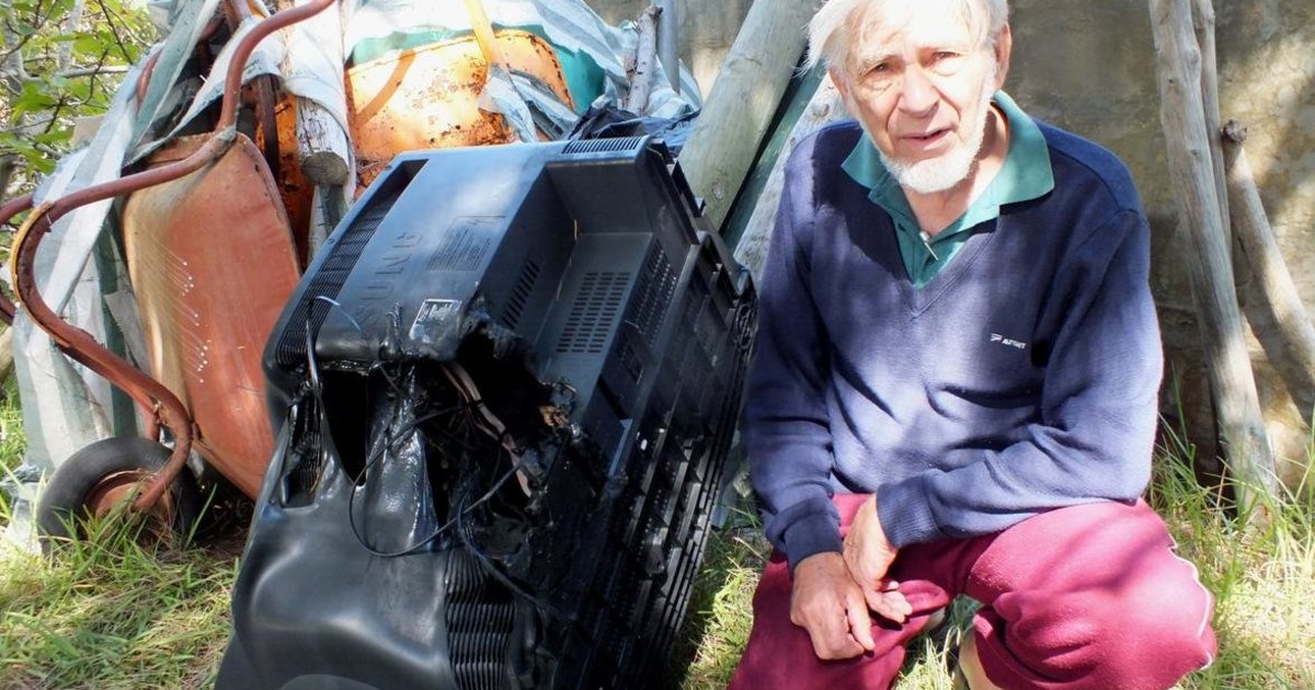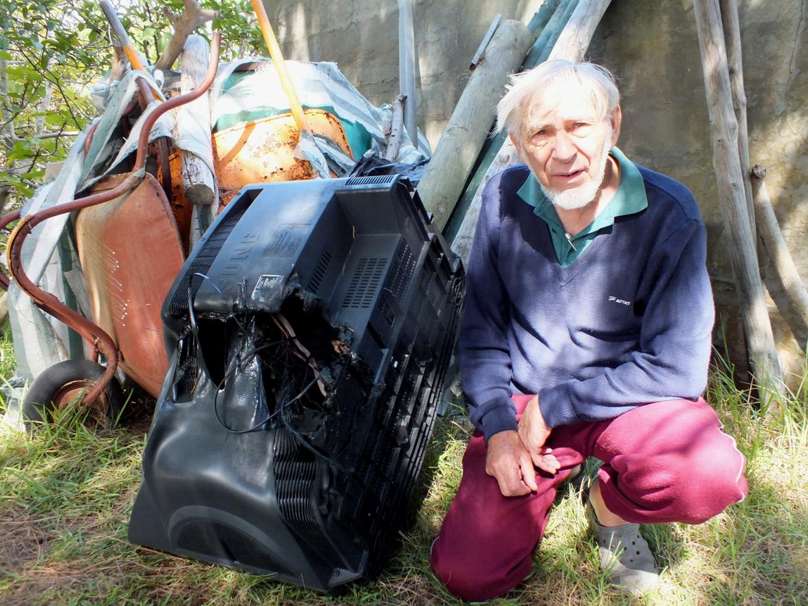 Neville Harker sit langs sy TV wat, nádat dit ontplof het, op die ashoop beland het