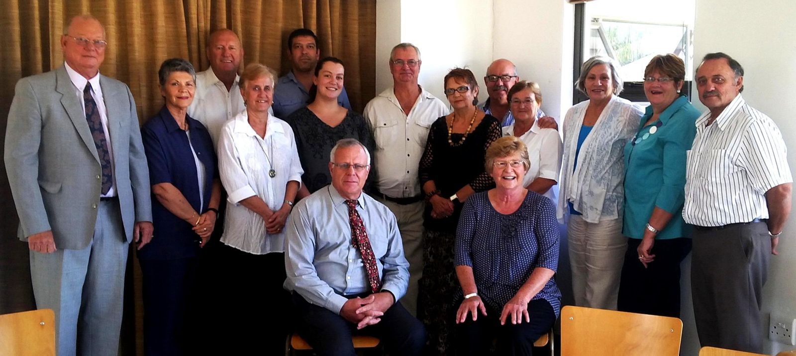 Links is Chris Eygelaar en Petro Trautman, met ds Dirk van Dyk en Annie le Roux voor, saam met die nuwe intrekkers agter hulle