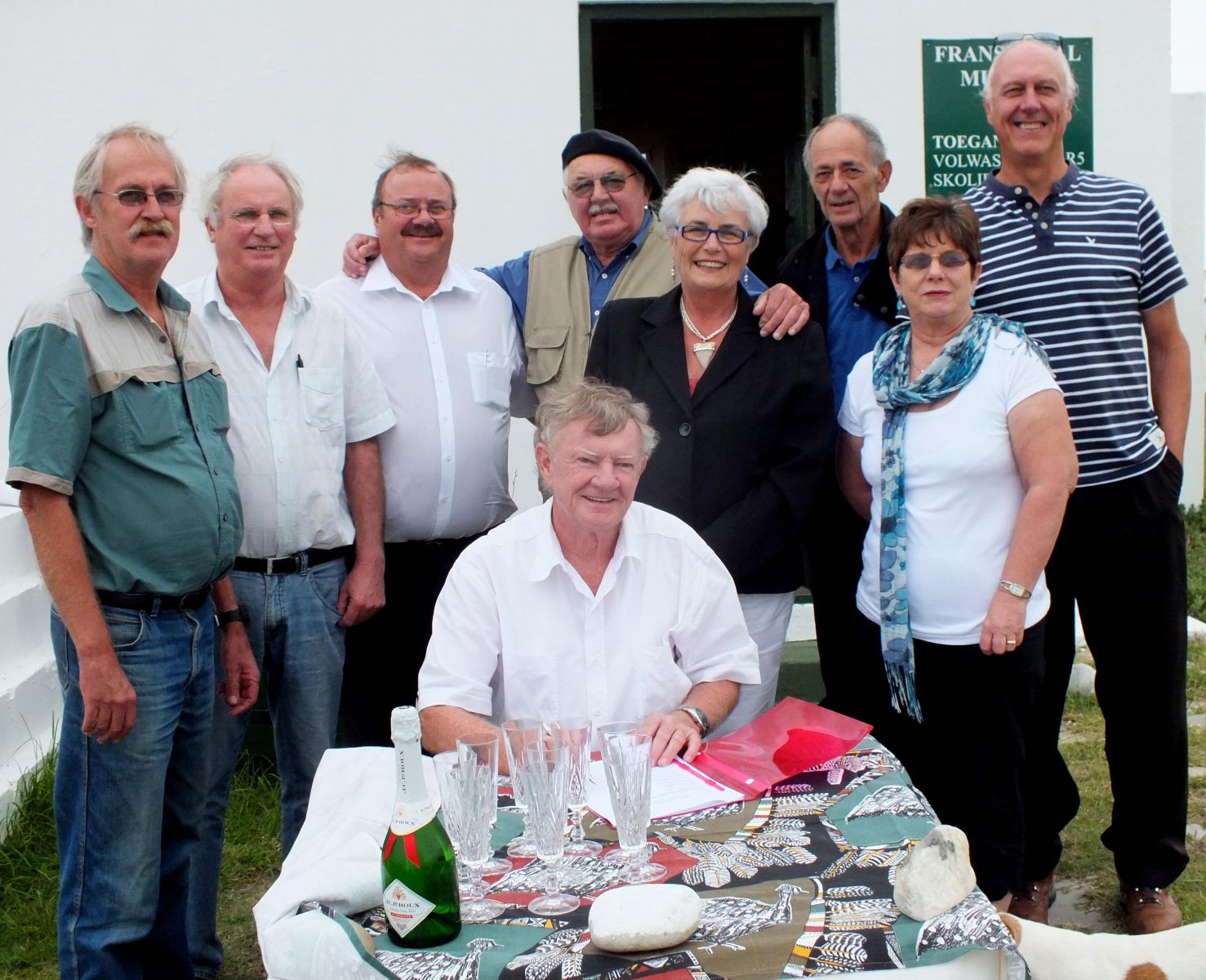 Voor: Rdhr Pieter Scholtz (voorsitter). Agter vlnr: Komiteelede*: Ben Gericke*, Francois de Jongh*, Kat Myburgh*, Jan en SD Fourie (skrywers), Herman Fourie*, Glenda Kitley*, Johan Coetzee* (Uitgewer Naledi)