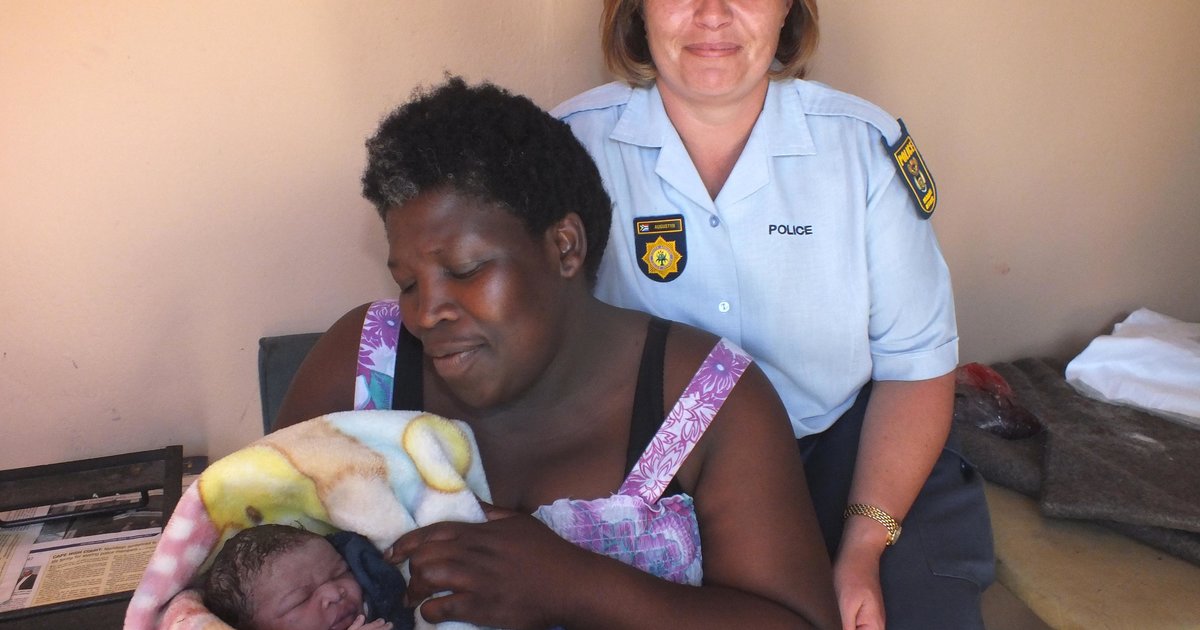 Babalwa Mangela met haar pasgebore baba in Gansbaai SAPD se gebou, met AO Blanche Augustyn langs haar wat die baba gevang het
