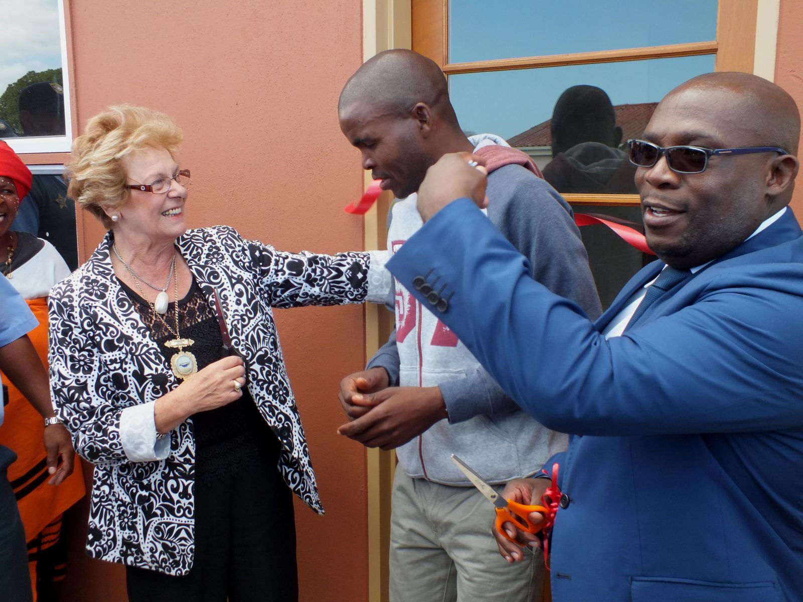 Links het rdl Nicolette Botha-Guthrie pas die lint van een van die voltooide huise geknip, met die nuwe eienaar langs haar en minister Bonginkosi Madikizela wat toekyk