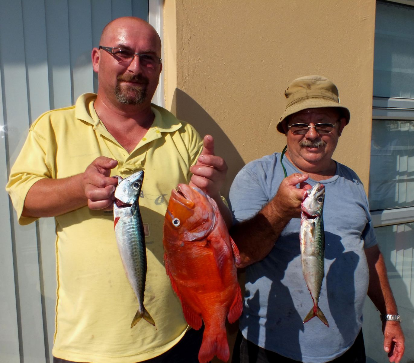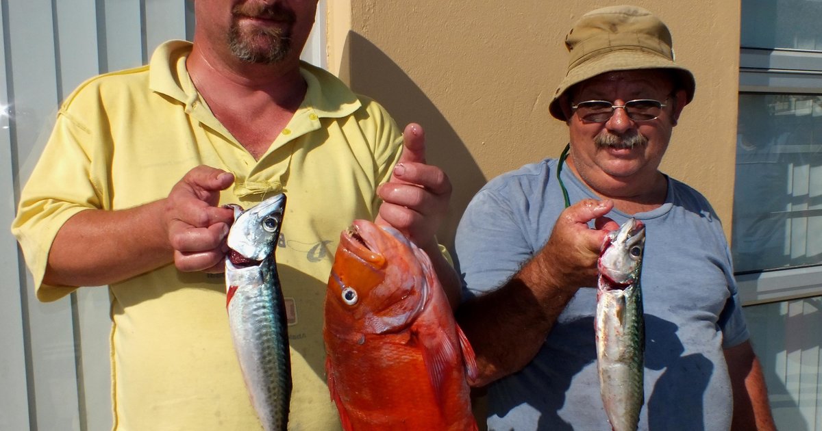 Onderskeidelik links en regs is Salmon Herselman en Thys Fourie elk met ‘n mooi Makriel, met Salmon wat ook sy pragtige Rooi Roman vertoon