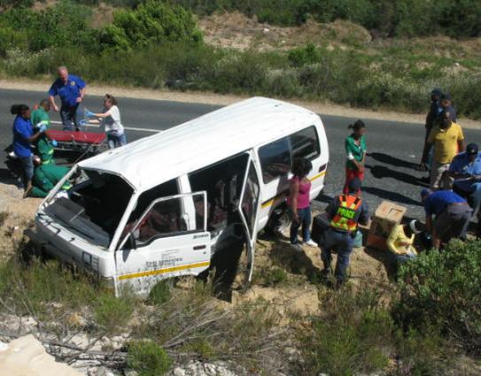 'n Volgelaaide taxi met 16 insittendes plus die bestuurder, Katiso Falatsa, het op Woensdag, 12 Desember 2012 op die R43 op pad na Stanford eenmaal gerol en daarna die bosse ingebars.