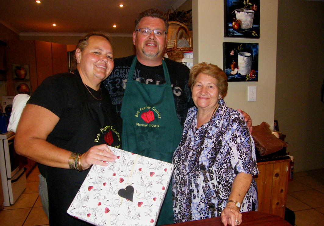 Regs oorhandig Petro Oosthuizen 'n blyk van waardering aan die spyseniers van die aand, Mornay en Charmaine Fourie van Red Pepper Catering