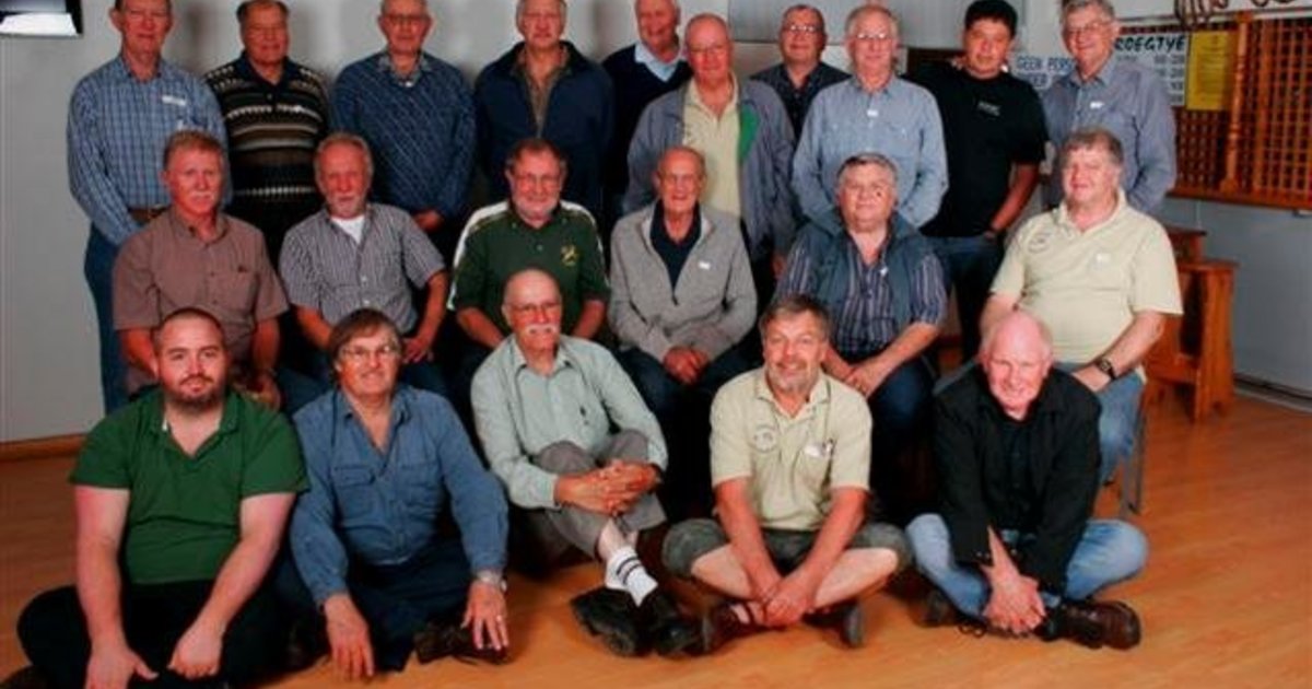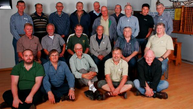 Die groot groep Houtwerkers van die Overberg Houtwerk- en Houtdraaiers Assosiasie tydens hulle jaarafsluitingsfunksie, met voorsitter Hennie Prinsloo voor, tweede van regs
