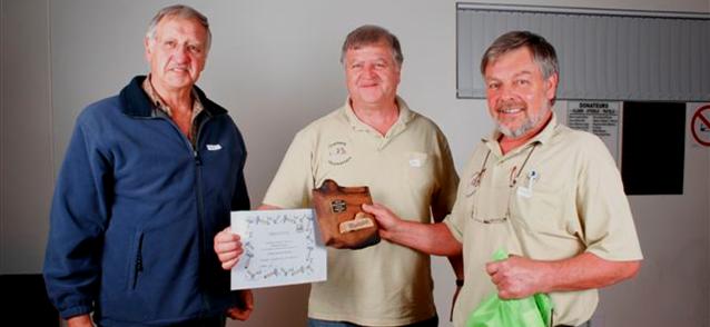 Voorsitter Hennie Prinsloo ontvang sy sertifikaat en trofee as Erelid, met vlnr Hannes Ludick, Ben de Lange en Hennie Prinsloo