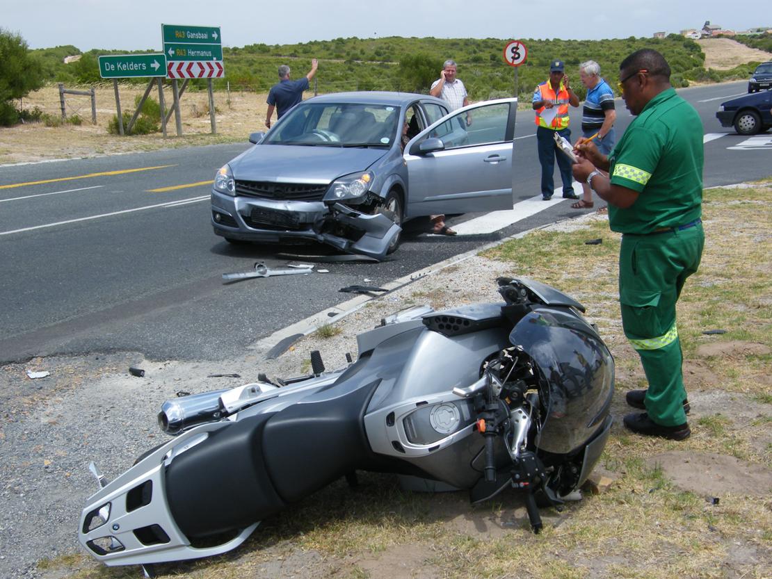 Hy was vanaf Stanford oppad en alhoewel daar ‘n dubbelbaan aan sy kant van die pad was het ‘n bakkie van Sterling Delta die DMW 12RT van agter getref. Die motorfiets is onder Hart uitgestamp en hy het op sy linkersy in die pad geval en skuurwonde opgedoen. Die BMW is oor die pad, reg voor ‘n aankomende voertuig met bejaarde insittendes, geslinger en die motor is links voor getref. Die bestuurder en sy vrou is nie beseer nie. “Ek kon nie glo dat dit gebeur het nie en het vir die bakkie se bestuurder gevra of hy wydsbeen oor die sperstreep in die middel van die pad gery het. Hy wou my egter nie antwoord nie” het Hart, wat tydens die ongeluk met Mnr. Monty Whitting, wat tuis na ‘n ernstige operasie aansterk, se motorfiets gery het. “Ek en hy het baie keer saam met ons motorfietse gaan ry en hy het vir my gevra om pos vir hom in Hermanus te gaan afhaal.” het Hart gesê.