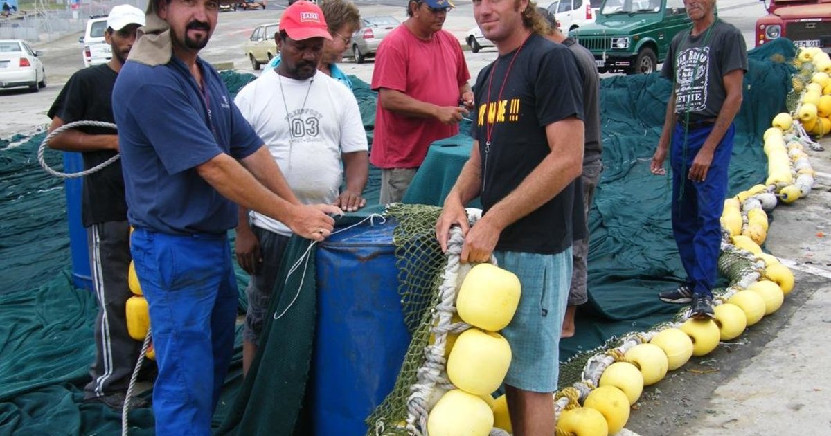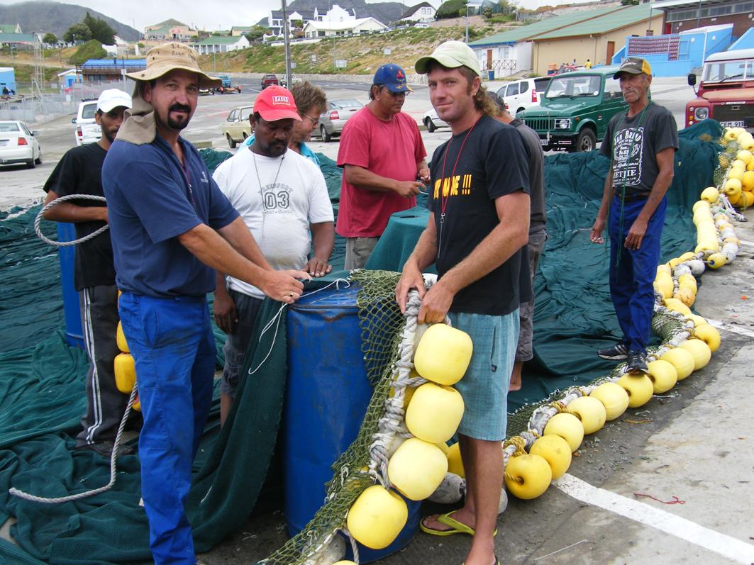 Vlnr is Jan Human, Apie van der Raath, Piet Otto (Skipper, weggesteek), Vleis Vermeulen, Johan (Visgees) Marais en Ben Oosthuizen van Kolgans tydens hulle boet van nette