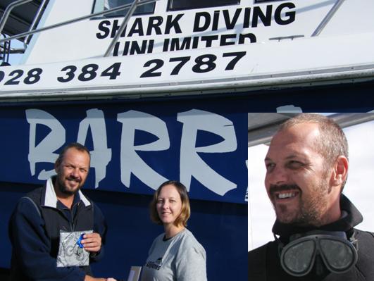 'n Gansbaai Courant argieffoto van Michael Rutzen (“Sharkman”) van Shark Diving Unlimited, tydens die oorhandiging van 'n borgskap aan Jackie Lombaard ten bate van die Fees van die Ganse se Bergfiets-item