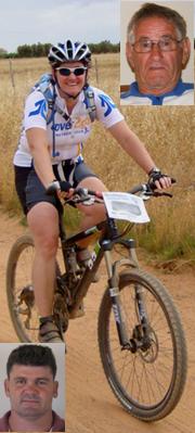 Desiree Doran wat tydens die Lighuis-tot-Lighuis Berg-fietswedren by Sopieshoogte aangeval is, ry hier op haar bergfiets, met haar twee Gansbaai weldoeners, Johan Hanekom (bo) en Tot Fourie (onder) op die inlasfoto's.