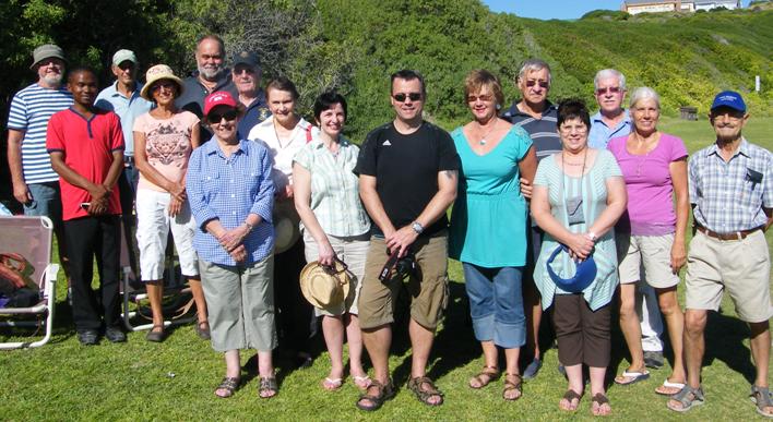 Belangstellendes wat 'n gesellige kenmekaar-piekniek te Stanfordsbaai bygewoon het.