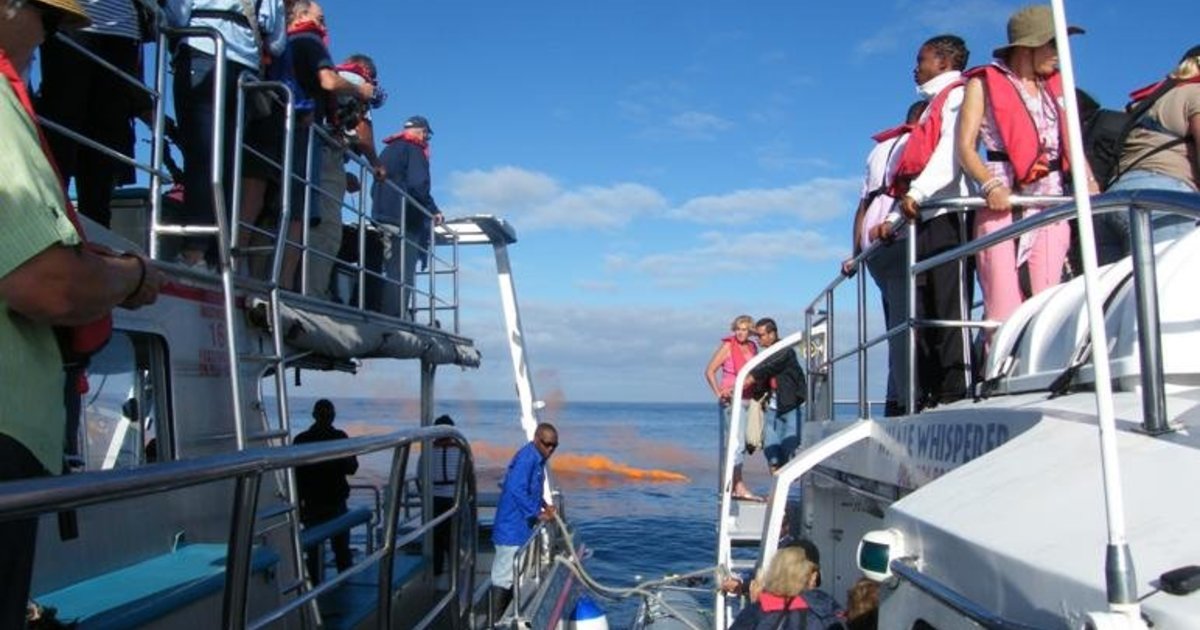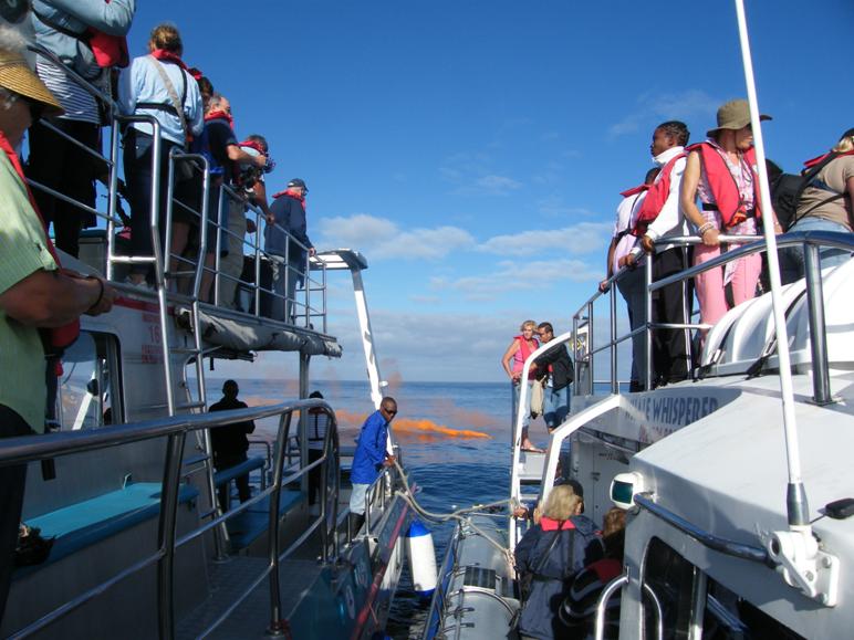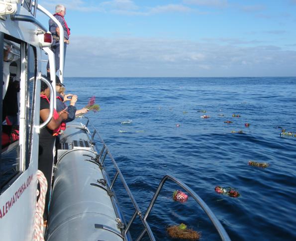 Die kransleggingseremonie ter see vanaf die bote Whale Whisperer en Slashfin