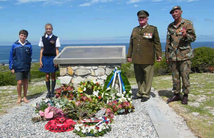 Links is Jan Kotze en Zulene van Niekerk direk ná hul kranslegging namens die laerskole by Danger Point, saam met twee van die weermaglede wat die Gedenkdiens bygewoon het