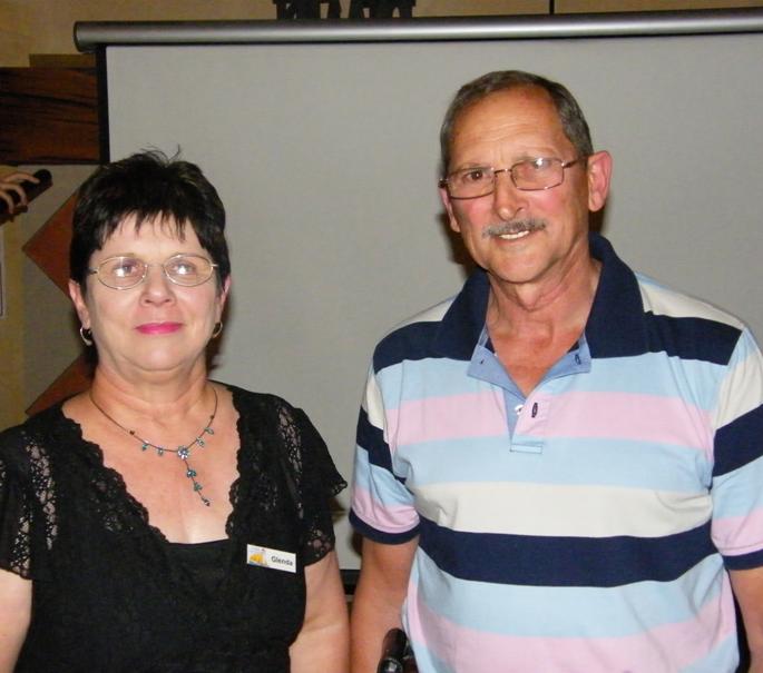 Die gasspreker, Charles Shapiro, wat 'n skyfievertoning oor die uitduik van items in die HMS Birkenhead aangebied het, saam met Glenda Kitley wat 'n blyk van waardering aan hom oorhandig het