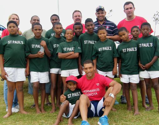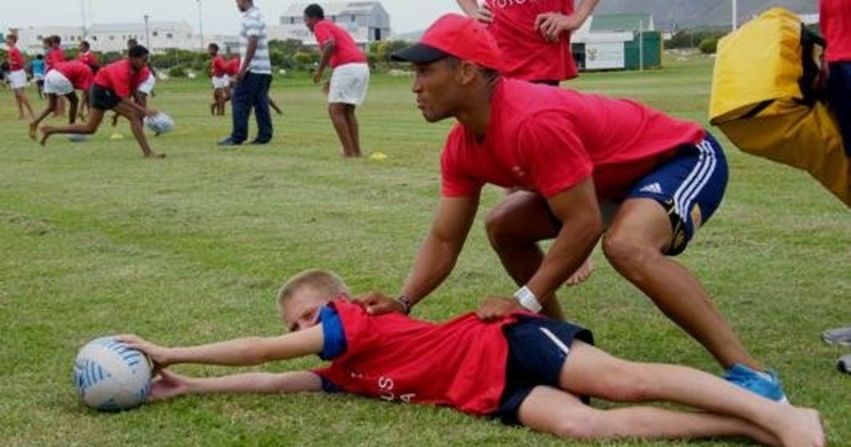 Gio Aplon in aksie bokant 'n laerskoolleerder tydens sy en Hermanus Toyota se afrigtingskliniek in Gansbaai vir o/13 rugbyspanne