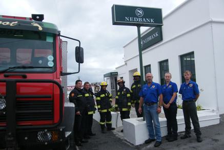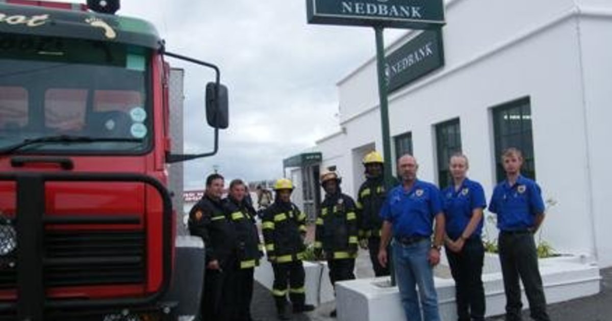 Die koppe het beslis onlangs gedraai met Gansbaai Brandweer en Overstrand Medical Response se bedrywighede by Nedbank in Hoofstraat. "Nee-wat, niks om bekommerd oor te wees nie," het Nedbank se Takbestuurder, Clayton Sauls gesê. "Die Nedbankgroep het lankal reeds 'n beleid ingestel waarin bepaal word dat alle Nedbank-takke minstens een keer per jaar 'n ontruimingsoefening moet aanpak." Hy het Gansbaai Munisipaliteit vir só 'n oefening gekontak, waarna Gansbaai Brandweer in kennis gestel is, met 'n uitnodiging aan Cassie Carstens en Riaan Buys van Overstrand Medical Response om deel te neem. Gansbaai Brandweer se Divisie Offisier, Brian Lobb, asook Riaan en Cassie het bevestig dat die ontruimingsoefening suksesvol en glad verloop het. "Besighede, banke, instansies, skole, tehuise vir bejaardes en dies meer word genooi om soortgelyke oefeninge te reël," het Brian gesê. Tania Greeff van Overstrand Brandweer-dienste & Rampbestuur van Gansbaai Munisipaliteit kan by 028-384-8315 vir sodanige reëlings gekontak word.