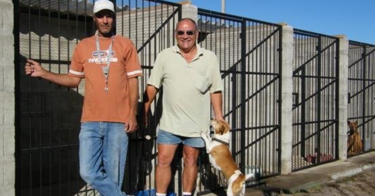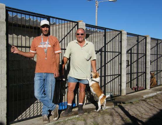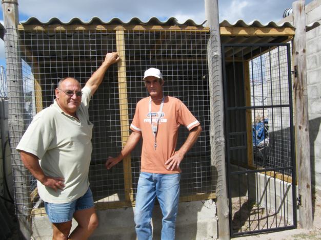 Gavin Hughes (links) en Phillip Schreck staan trots by die nuwe BARC-hokke, met Jacky, die permanente BARC-hondjie, by hulle
