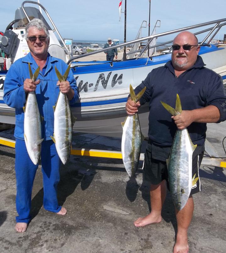 Johan Bauermeister (links) en Gawie Krugel by Nu-Nu, met van die geelsterte wat hulle by die Punt aangekeer het. ‘n Paar skipjacks is ook gevang.