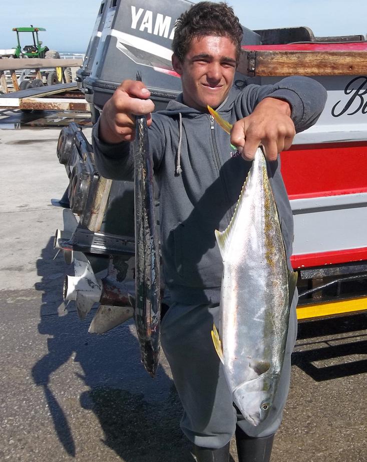 Brandon Groenewald met ‘n snoekie en ‘n geelstert. Eddie Kalbas, skipper van Black Label, kon spog met ‘n goeie vangs.