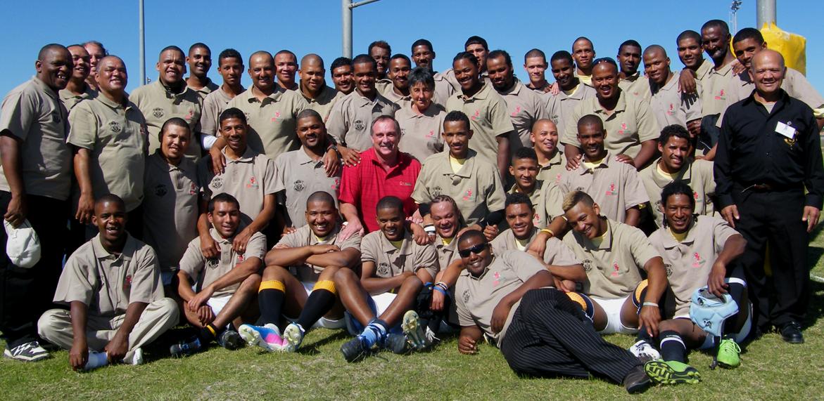 Black Leaves Rugbyklub se spelers is met T-hempies deur Gansbaai OK Foods geborg, met Chris van Rensburg, mede-eienaar van Gansbaai OK Foods in die middel.