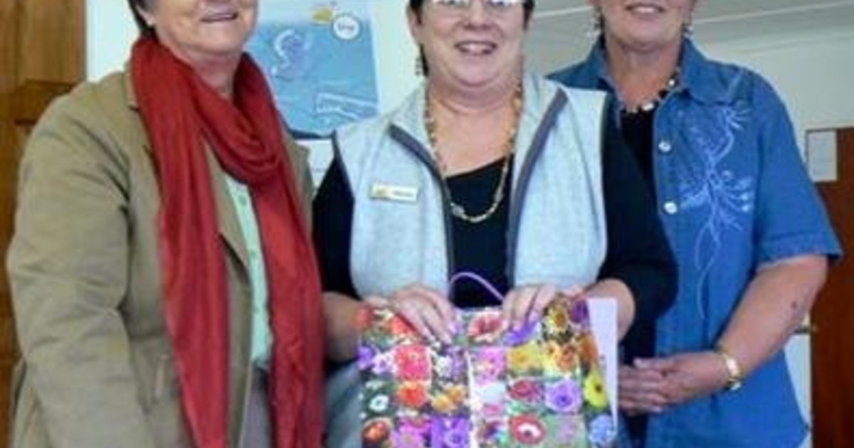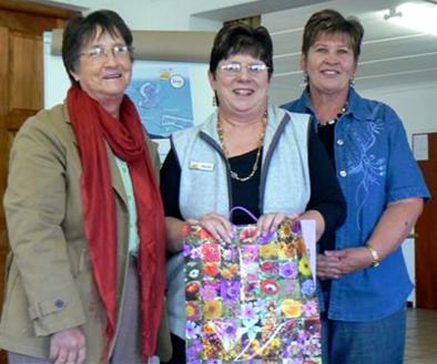 Vlnr is Lettie van Deventer, Glenda Kitley en Aletta Lochner tydens die oorhandiging van 'n blyk van waardering aan Glenda