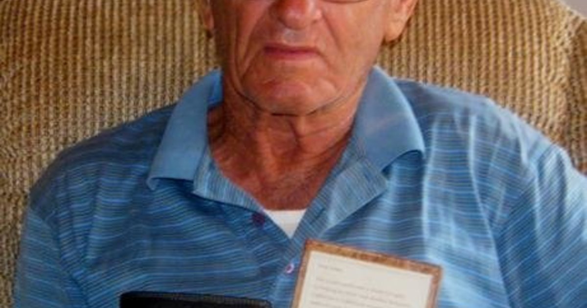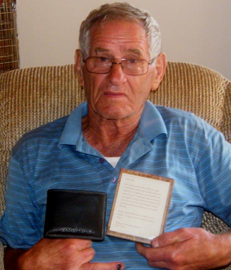 Johan Hanekom met die waardevolle beursie wat hy saam met kontant as 'n blyk van waardering van Desiree Doran ontvang het