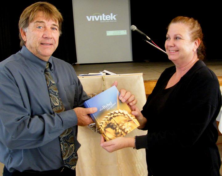 Rozette Katzen van De la Batskool vir Dowes oorhandig 'n besonderse Bybel vir Dowes aan dr Bobo van Zyl van die NG-gemeente as 'n blyk van waardering
