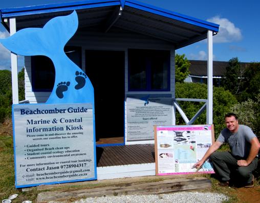 Die nuwe Beachcomber Guide Marine & Coastal Information Kiosk in Pearly Beach van Jason Stonehewer, met Jason voor die houthuisie