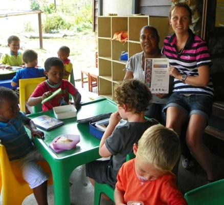 Natasha Forbes (right) with Bernadine Damon next to her with the Eco-Schools Certificate, with pre-school children sitting at their desks
