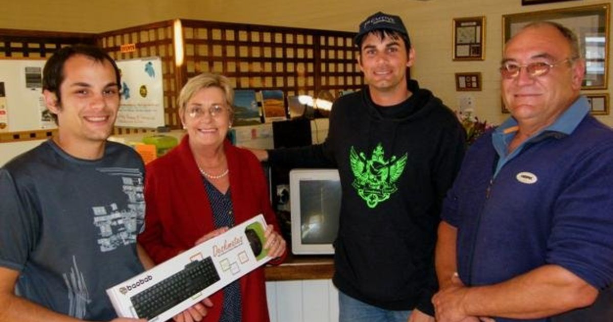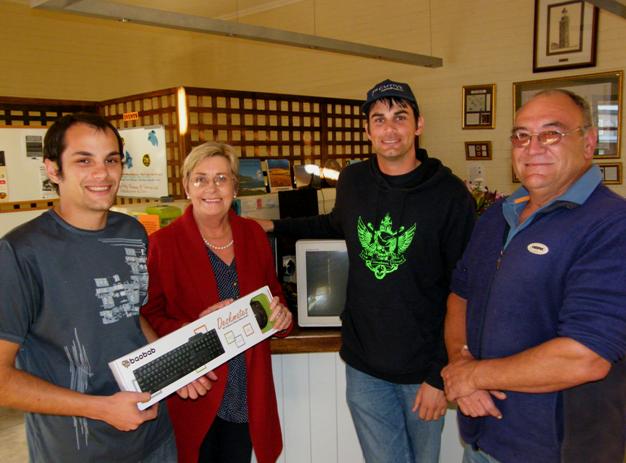 Gansbaai Gamers se rekenaarborgskap aan BARC, met vlnr Riaan van Lill, Annalie Jonker, Jacques van Lill en Phillip Schreck, met die rekenaar en toerusting by hulle in Gansbaai Toerismekantoor