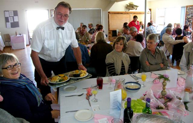 Een van die "kelners", Steve Muller, besig om die gaste te bedien