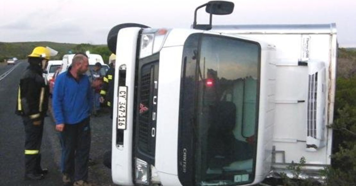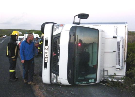 'n Afleweringstrok van Henties Fruit Juices het op Dinsdag, 21 Mei op die R43 na Gansbaai die pad byster geraak, op sy sy beland en etlike meters ver oor en langs die teerpad geskuif.