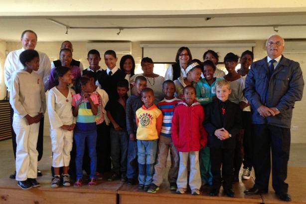 Links is Wesley van der Poel en regs is Warren Hardenberg saam met die volwasse- en kinderkoorlede tydens die Nuwe Apostoliese Kerk se Pinkstervoorbereidingsdiens