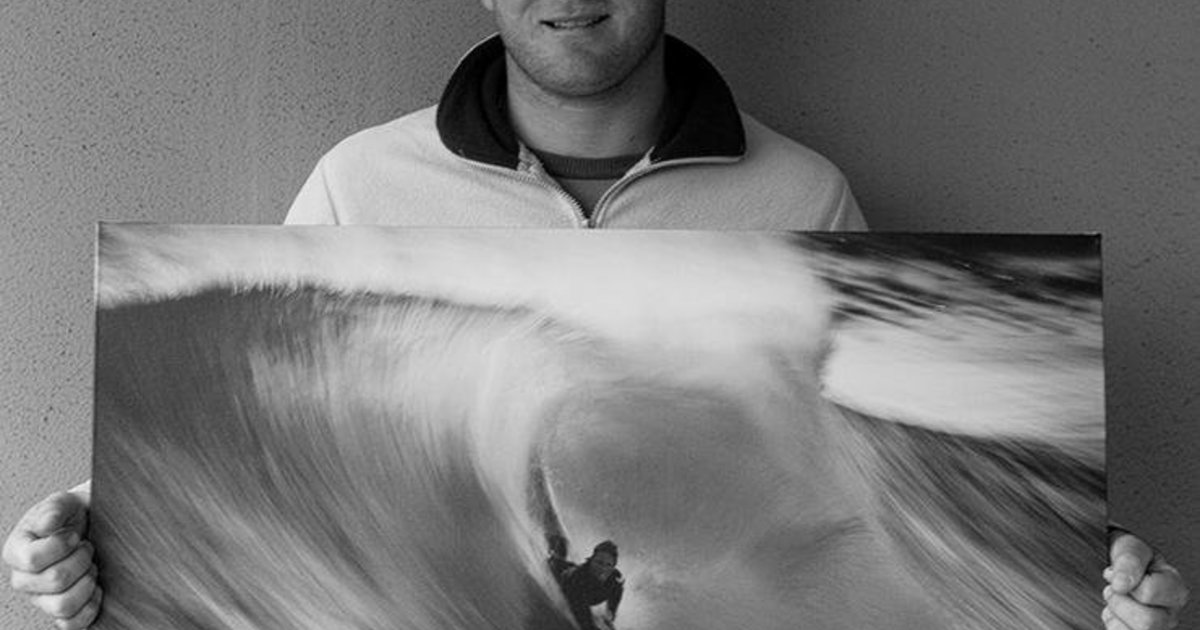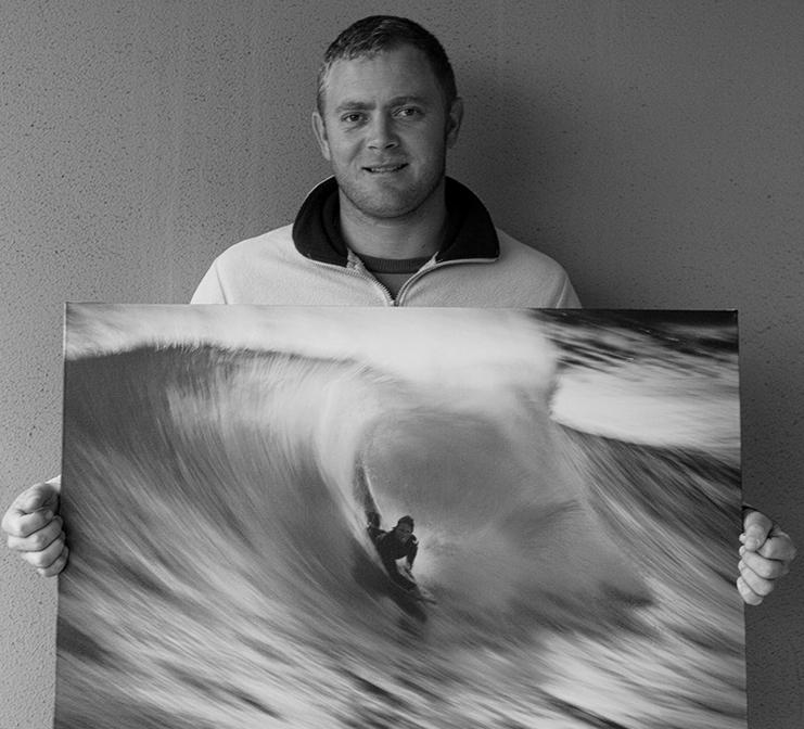 Hugh-Daniel Grobler met 'n vergrote foto van sy "Branderplankryer" by Gansbaai hawe